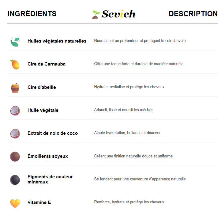 Sevich est formulé avec des ingrédients naturels et doux qui respectent votre cuir chevelu. Obtenez des cheveux plus denses, plus sains et d'apparence naturelle, jour après jour.